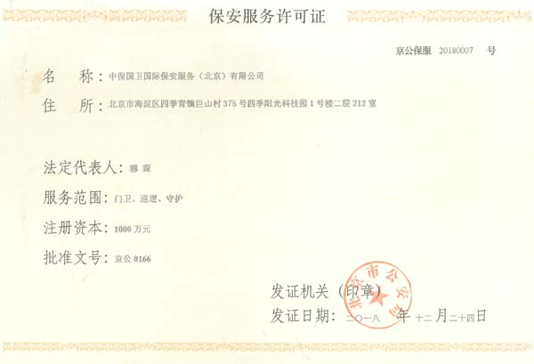 中保國衛(wèi)國際保安服務(wù)(北京)有限公司,屬中保國衛(wèi)集團(tuán)旗下子公司。能全方位的為大型客戶提供優(yōu)質(zhì)的安保、押運服務(wù),是集人防和技防于一體的新型正規(guī)化綜合安保押運服務(wù)企業(yè),提供人防、物防、技防、聯(lián)網(wǎng)報*、非武裝押運等安防相關(guān)的一站式服務(wù)。